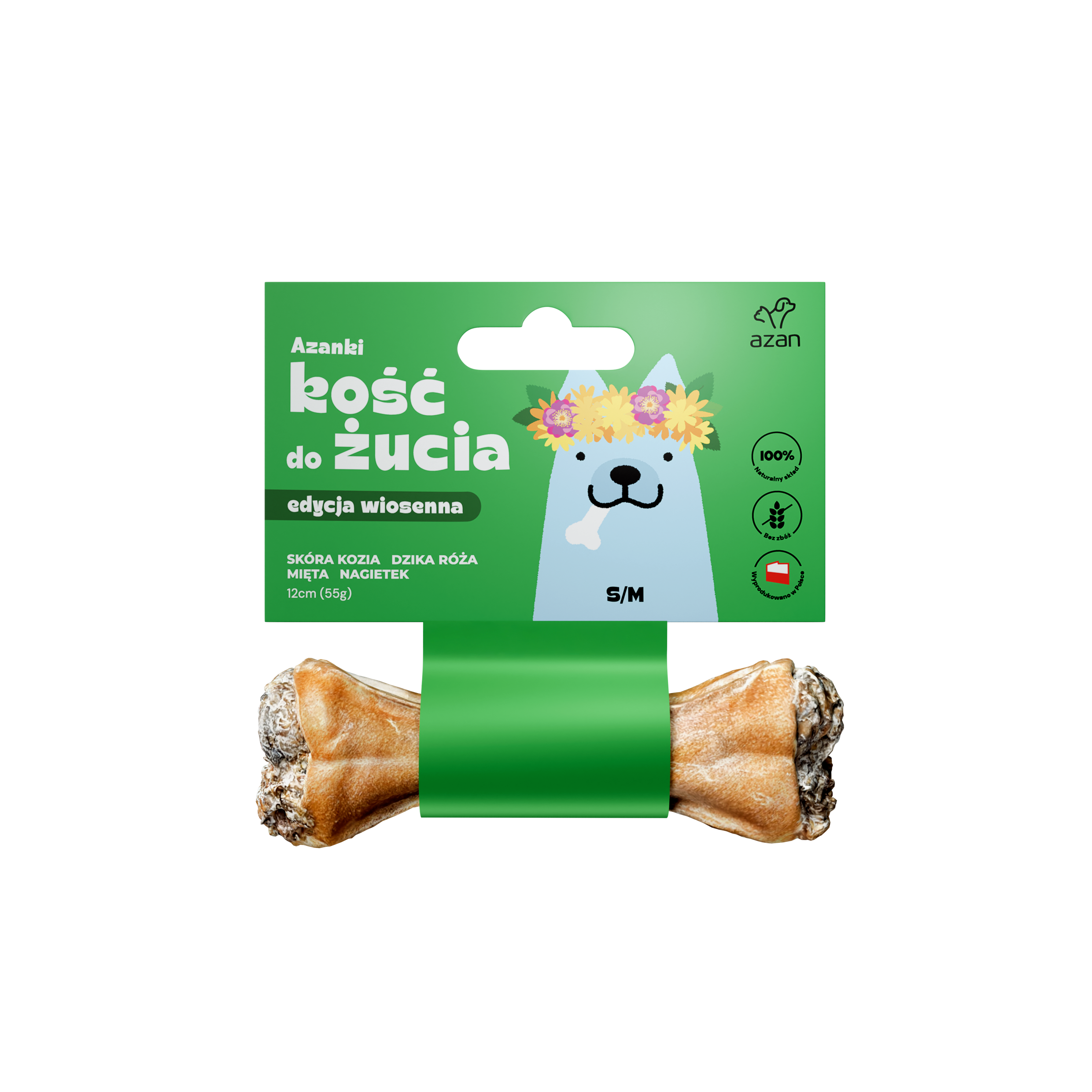 Azanki - Kość do żucia w skórze wołowej ze skórą kozią, miętą, dziką różą i nagietkiem (S/M 12cm/55g)