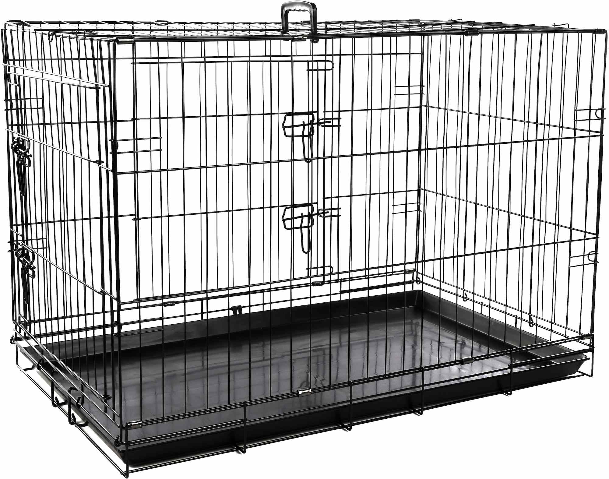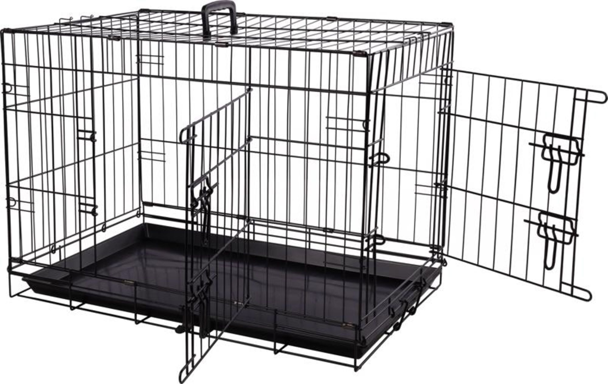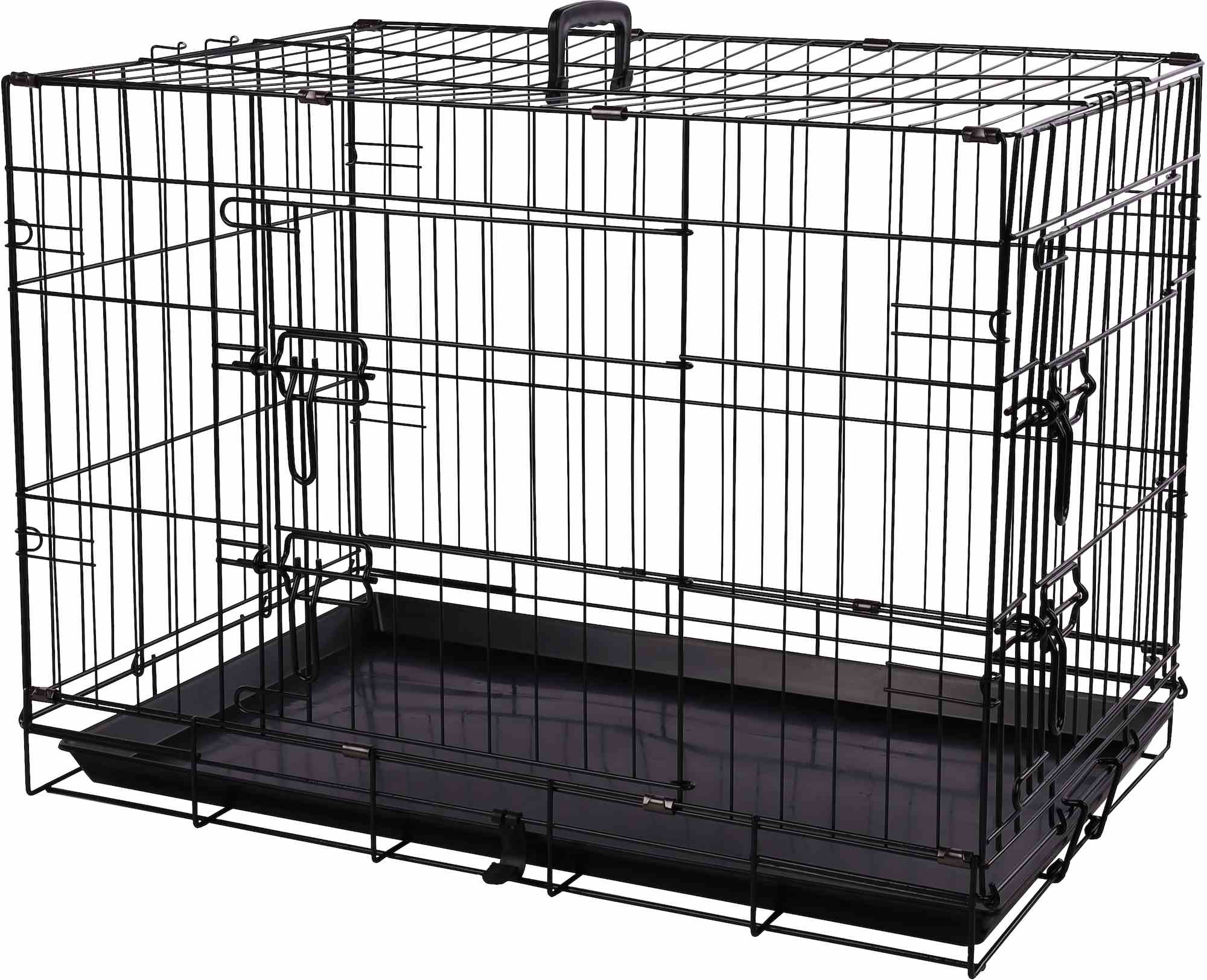 Metalowa klatka kennelowa zapewnia pupilowi dostęp powietrza. Posiada drzwiczki z przesuwnym zamkiem od frontu oraz z boku.
