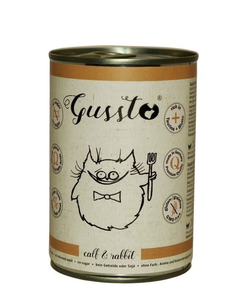Gussto - mokra karma dla kota cielęcina z królikiem. Pełnowartościowa, kompletna i znakomicie zbilansowana karma superpremium dla kotów. Produkowana jest w 100% z najwyższej jakości świeżego mięsa w wysokim standardzie odpowiadającym wymaganiom żywności dla ludzi. Gussto to esencja dobrego i zdrowego żywienia. Zawiera bardzo dużo mięsa idealnie odpowiadając specyficznym wymaganiom pokarmowym kotów.