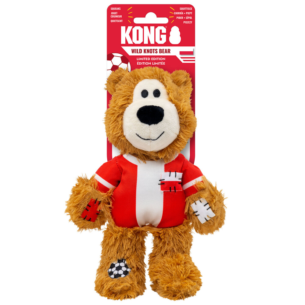 KONG® WILD KNOTS BEARS to miękka i zarazem wytrzymała zabawka dla psa, która ubrana jest w strój polskiego piłkarza. Niechaj pozory Cię nie mylą - nie jest to zwykła przytulanka. Pod wzmocnionym futrem KONG® WILD KNOTS BEARS kryje się zupełnie inna budowa wewnętrzna. Szkielet wykonany jest z zawiązanej liny, która tak bardzo pobudza naturalną potrzebę zabawy u psa, że nie będzie chciał przestać się bawić. 6 węzłów to spore wyzwanie dla zwierzęcego gracza. Dodatkowo w środku umieszczona została piszczałka, która zachęci do jeszcze większych harców.