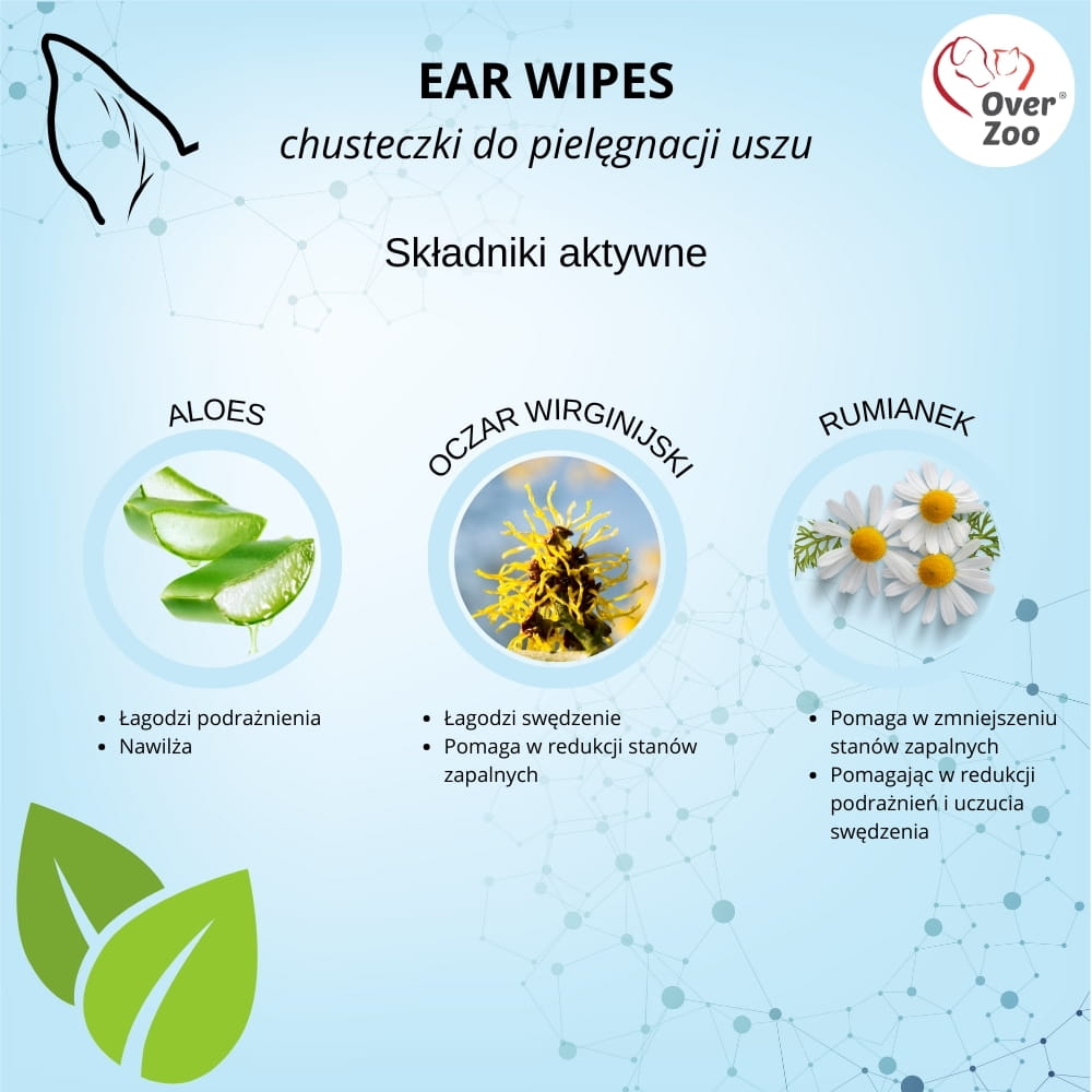 Chusteczki do pielęgnacji uszu psów, kotów i innych zwierząt domowych w formie wygodnych nakładek na palec. Zawarte w chusteczkach składniki, takie jak aloes, oczar wirginijski, rumianek, delikatnie oczyszczają ucho z woskowiny i zanieczyszczeń, wykazują właściwości nawilżające i łagodzące podrażnienia.