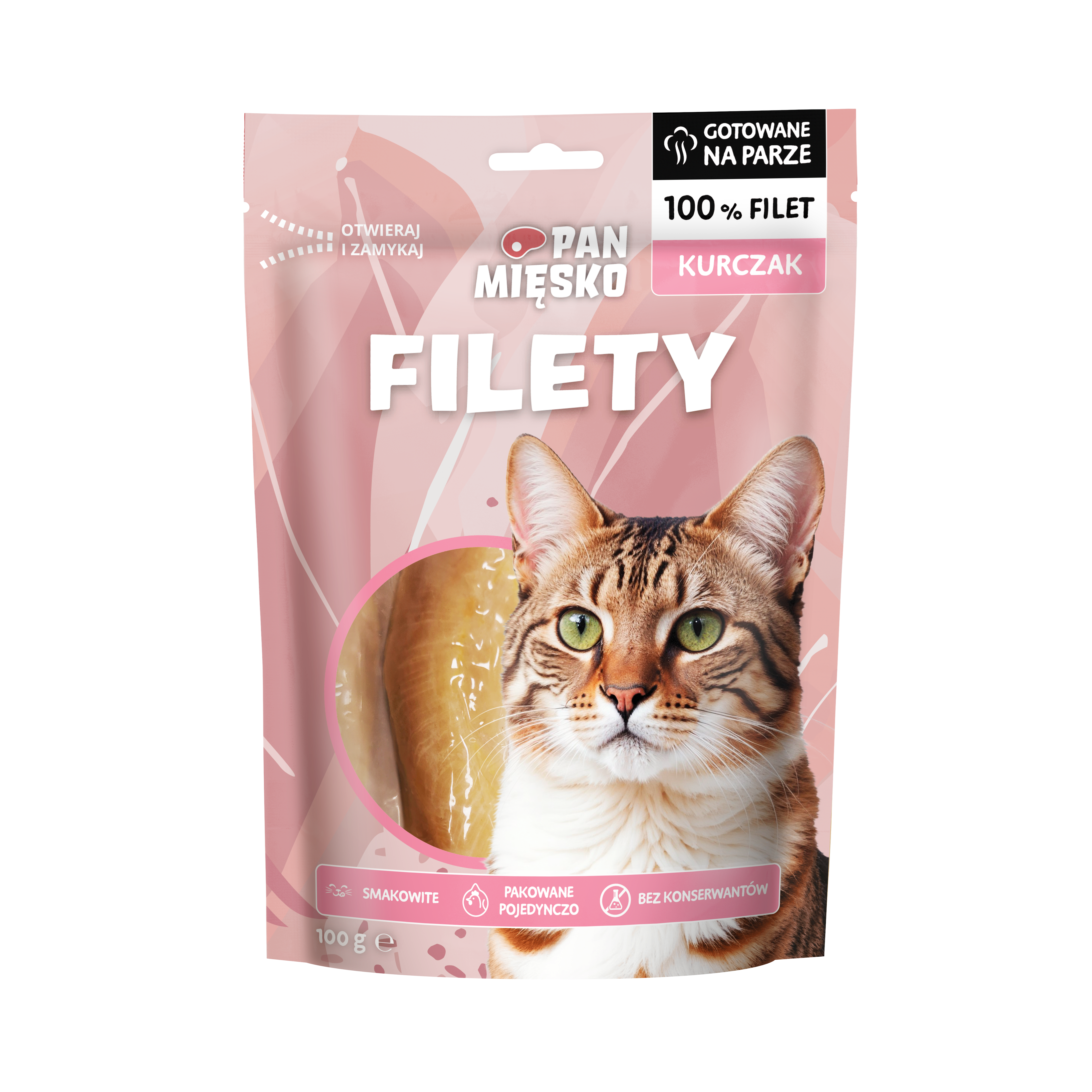 Przysmak dla kotów Pan Mięsko FILETY KURCZAK – KARMA UZUPEŁNIAJĄCA DLA KOTÓW POWYŻEJ 6 MIESIĄCA ŻYCIA. 100% filet z kurczaka – naturalny smak i jakość.
