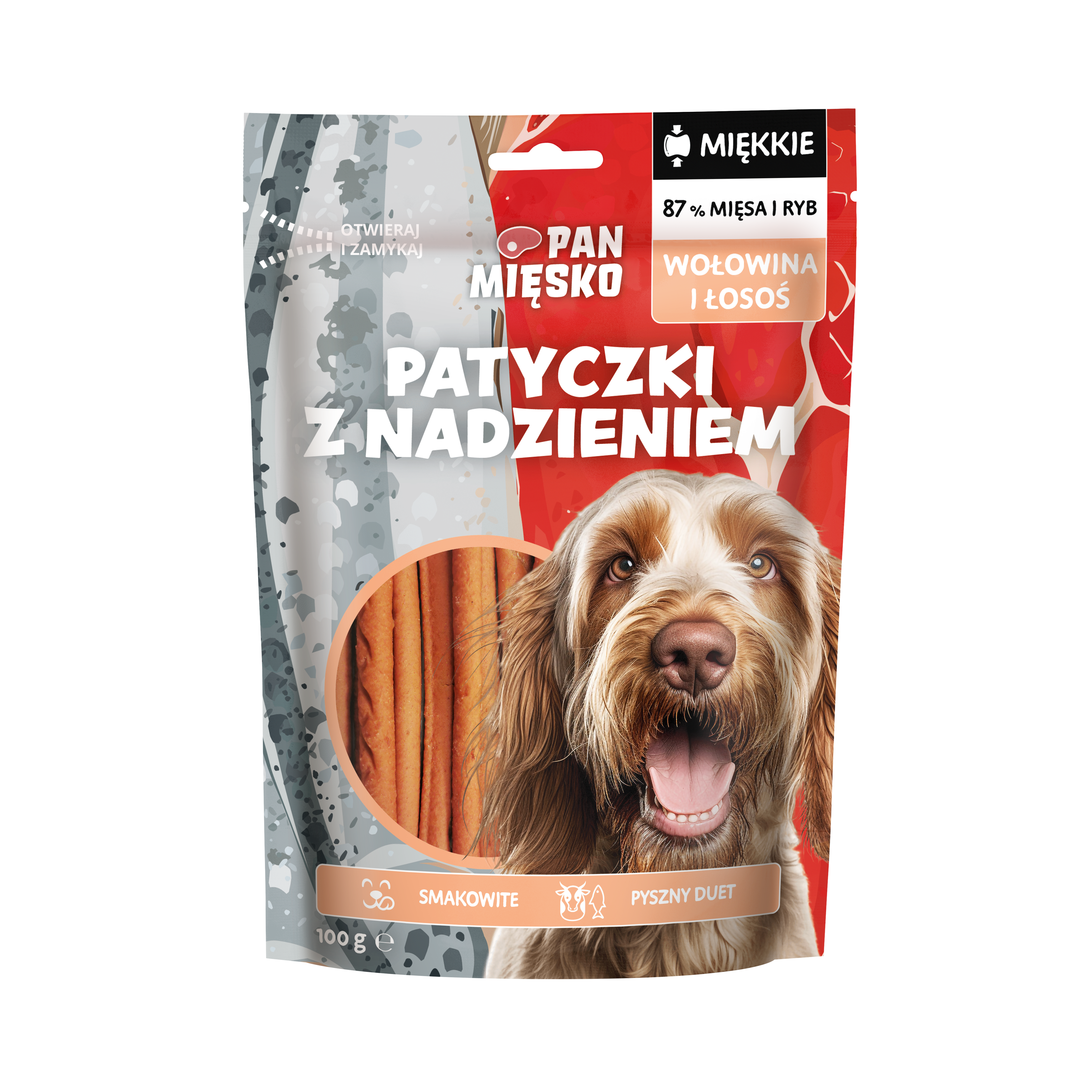 Szukasz wyjątkowych przysmaków dla swojego psa? Patyczki z nadzieniem Pan Mięsko to doskonały wybór! Zawierają aż 87% mięsa i ryb – wołowinę i łososia – dzięki czemu zachwycają naturalnym smakiem i aromatem.