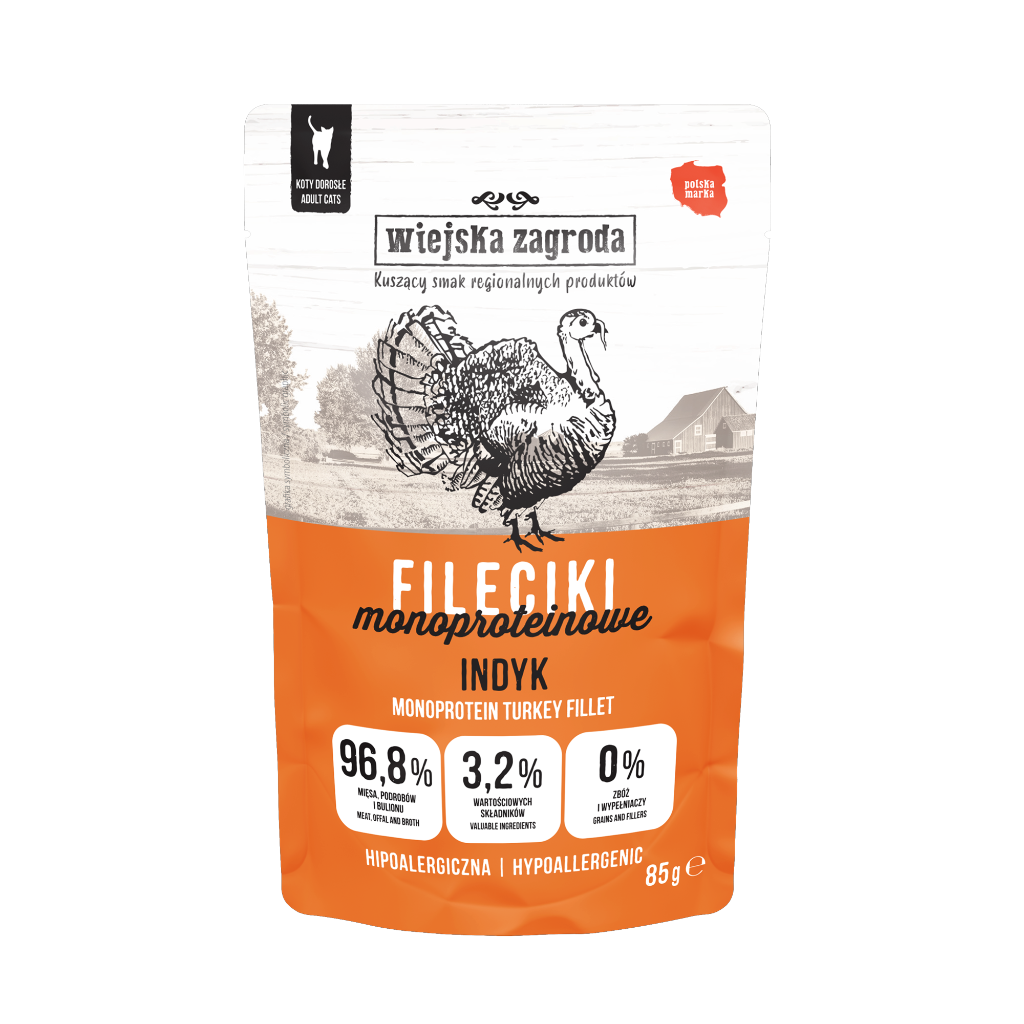 Karma mokra dla kota Wiejska Zagroda – Fileciki Indyk 85 g - Karma pełnoporcjowa mokra dla kotów dorosłych